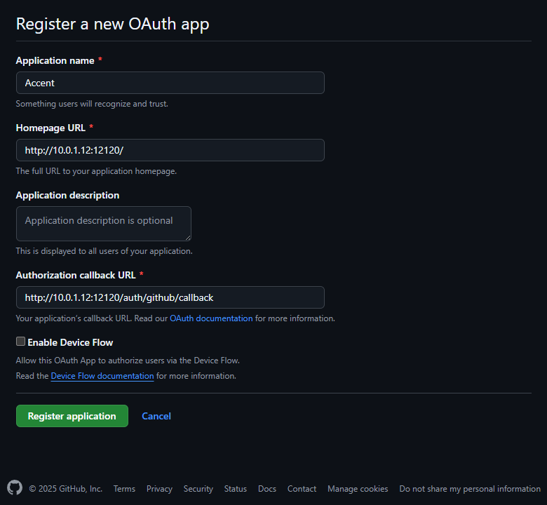 App name can be Accent, url is the same one you use to access the app and callback URL is the url + ‘/auth/github/callback’: