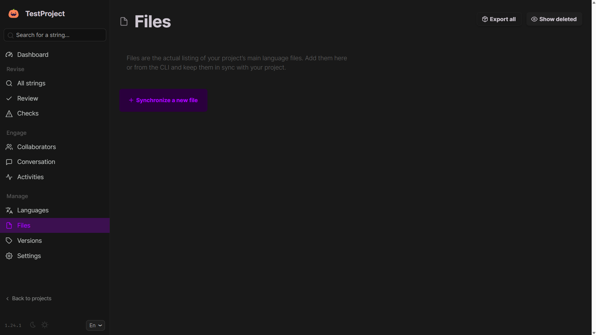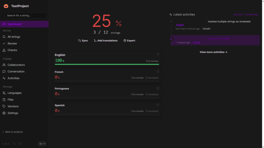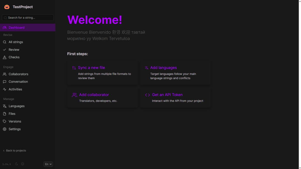 On the Dashboard you will be able to see the status of your project, because it just started, you first need to add files, languages, and collaborators: