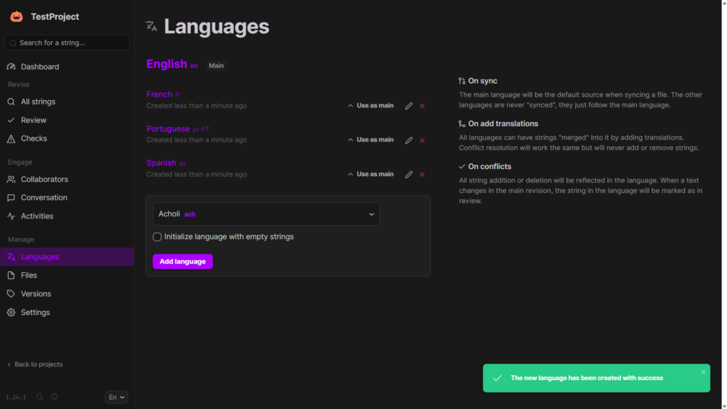 Adding languages is very easy, just go to the languages tab, choose one and click on add: